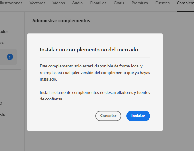 - Al no haberla subido a la Store de Creative Cloud, te pedirá confirmar la instalación de plugins de terceros.